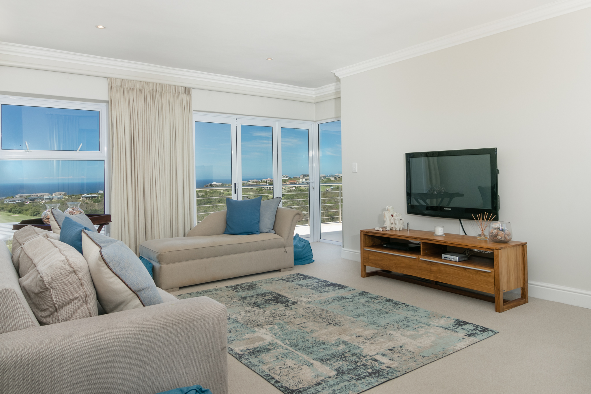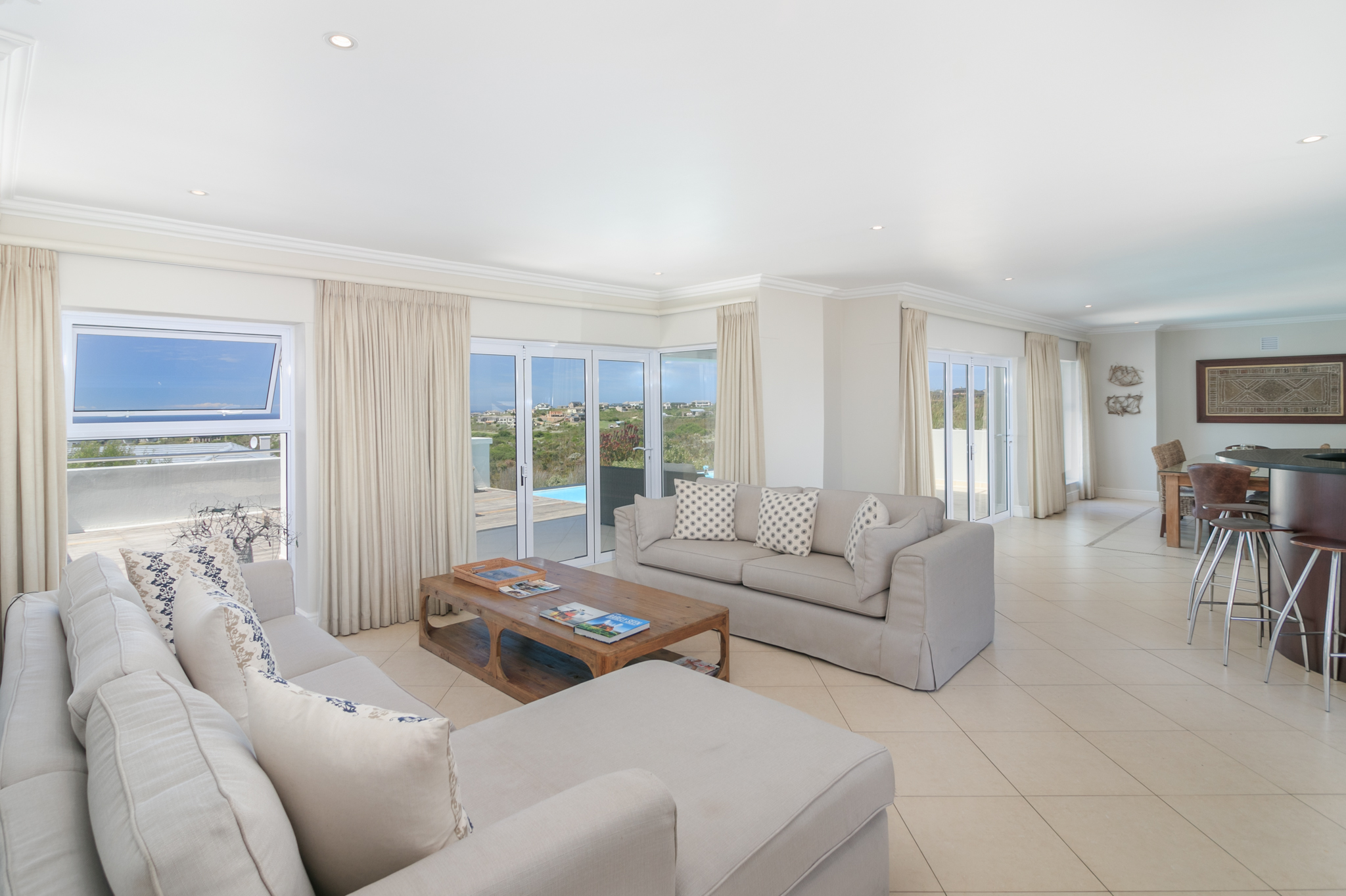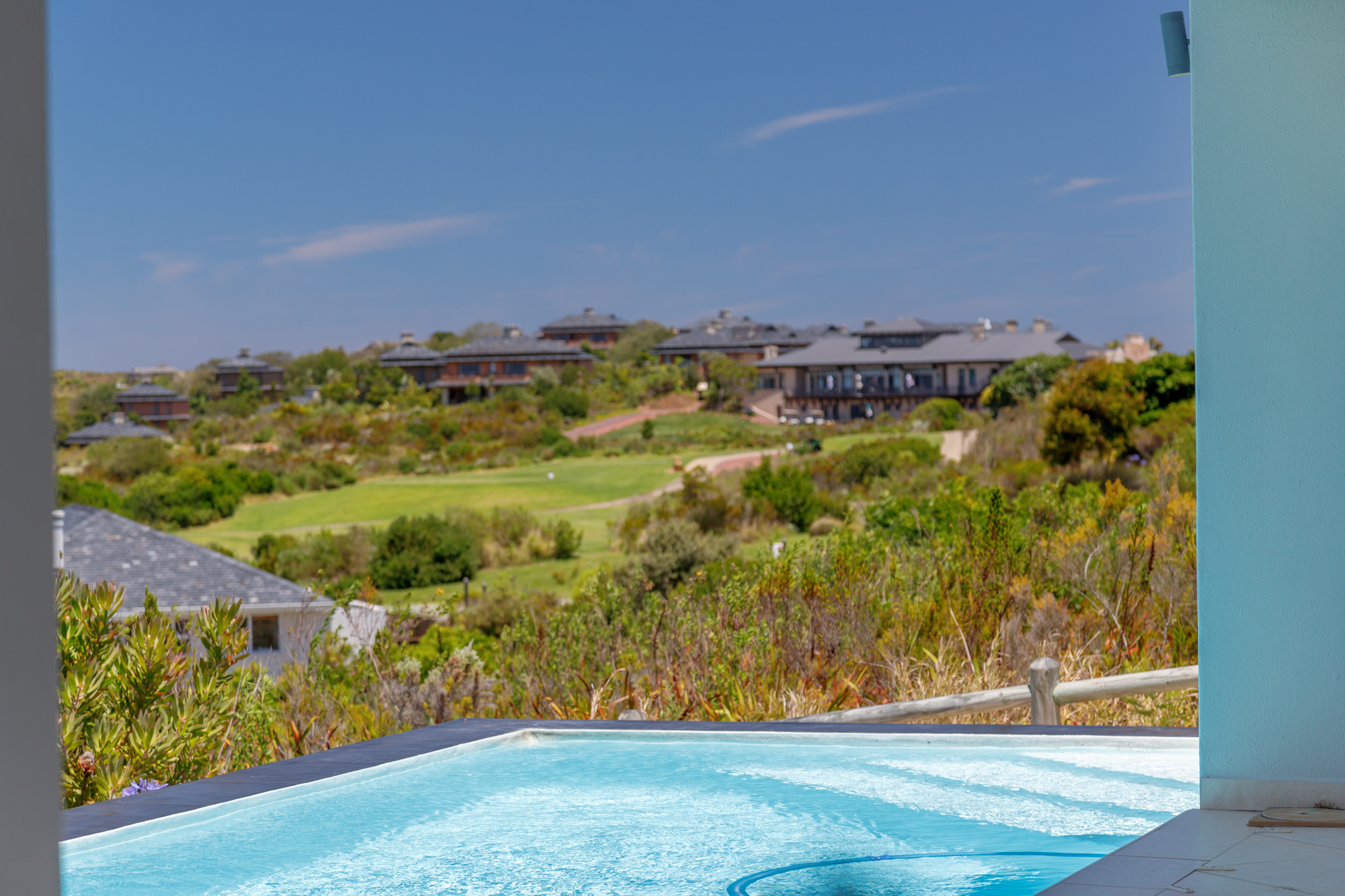 This stunning 5 bedroom property has a very large open plan kitchen and dining area and seclude sheltered rear patio with large built in braai. The front entertainment tiled patio, has a stunning rim flow swimming pool overlooking the Ocean, golf course and Outeniqua Mountains. Lots of room for a large family gathering or group.