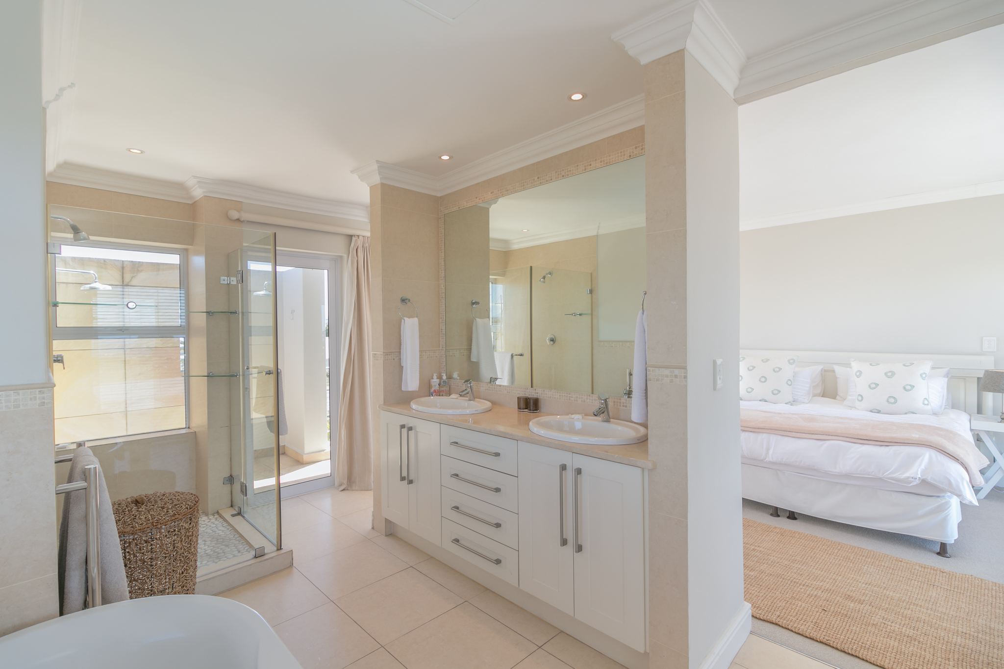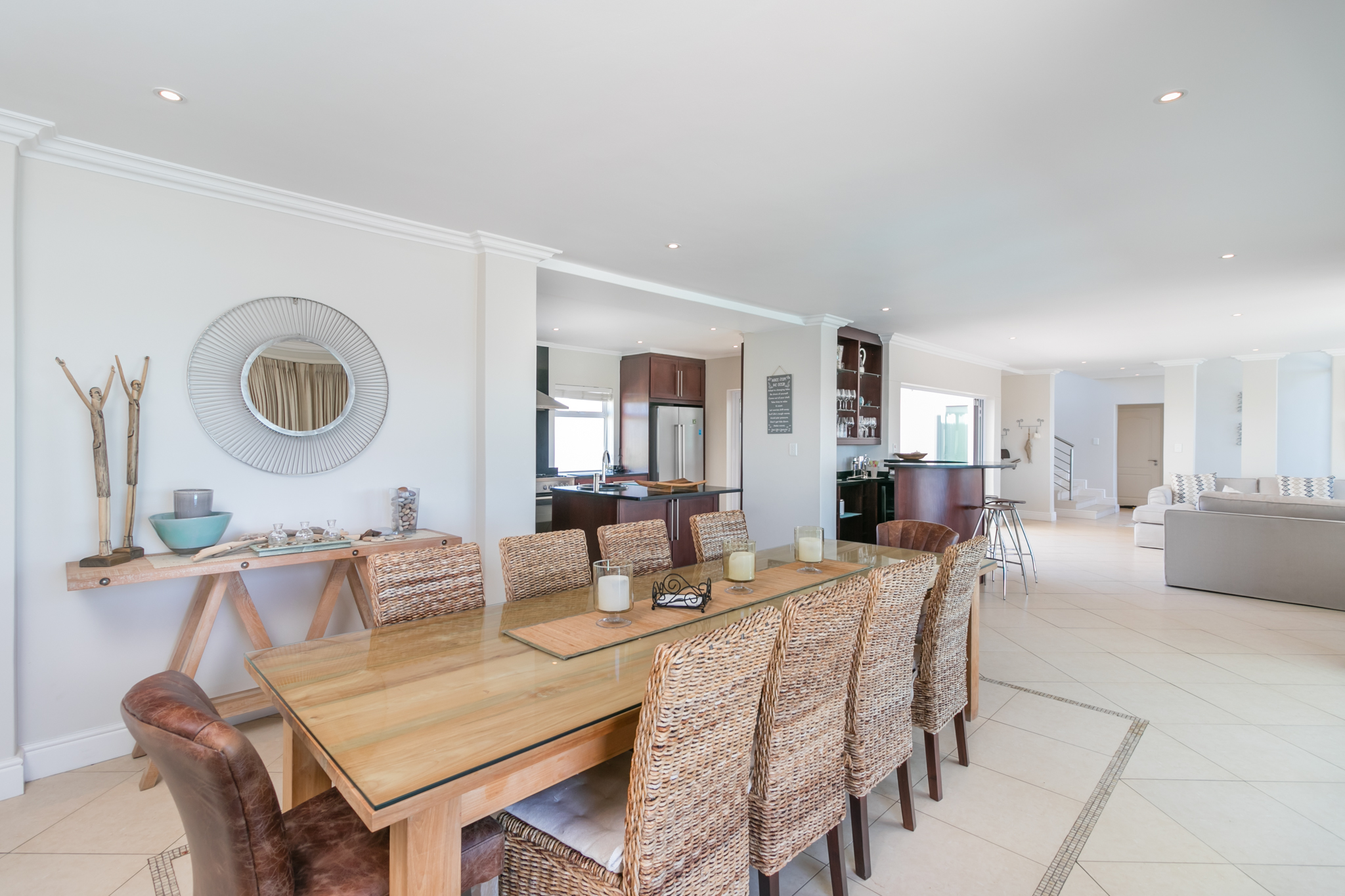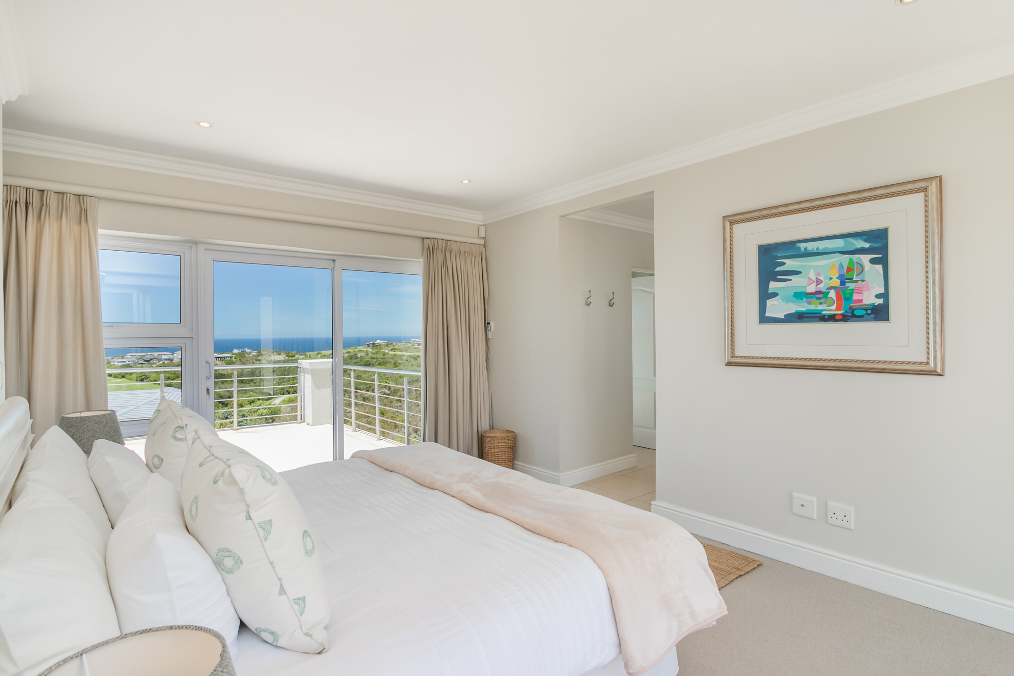 This stunning 5 bedroom property has a very large open plan kitchen and dining area and seclude sheltered rear patio with large built in braai. The front entertainment tiled patio, has a stunning rim flow swimming pool overlooking the Ocean, golf course and Outeniqua Mountains. Lots of room for a large family gathering or group.