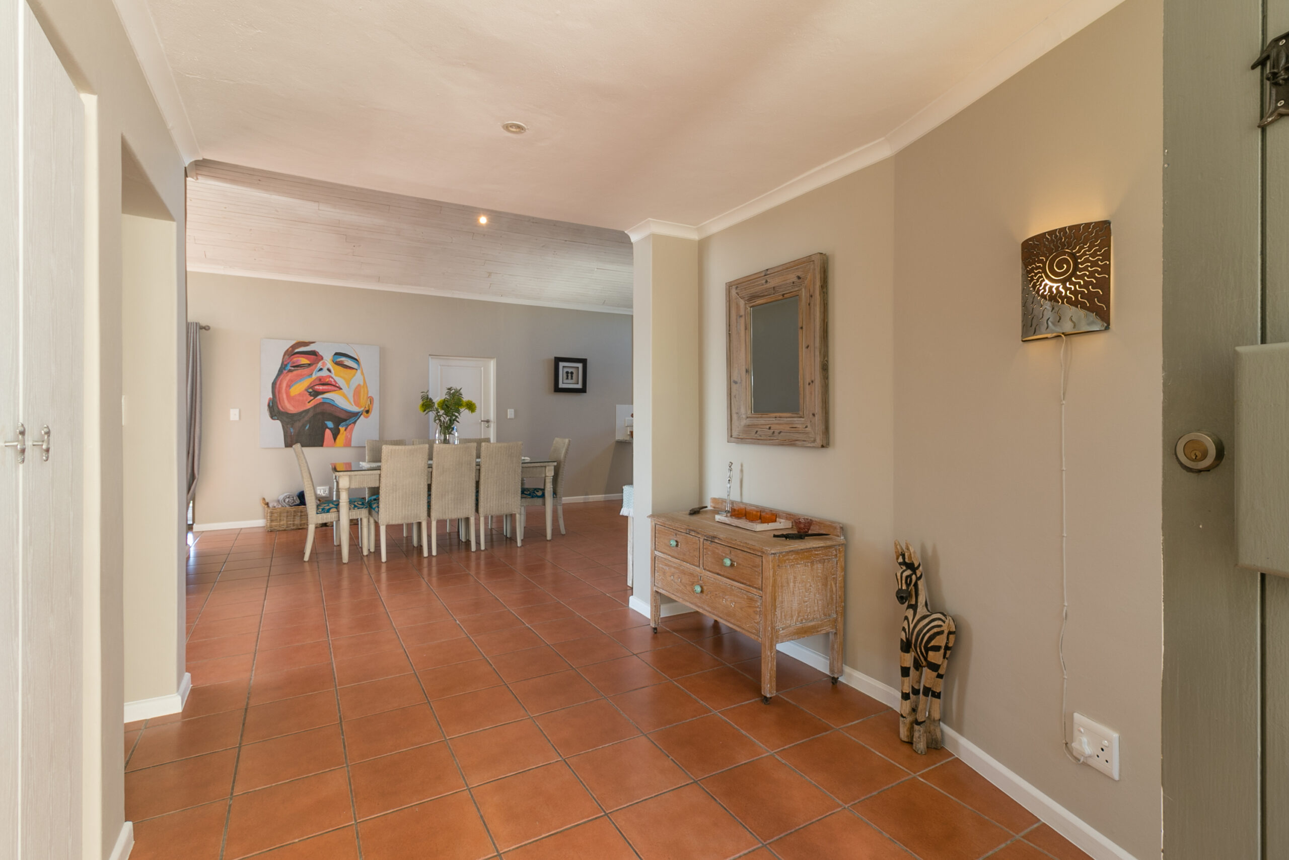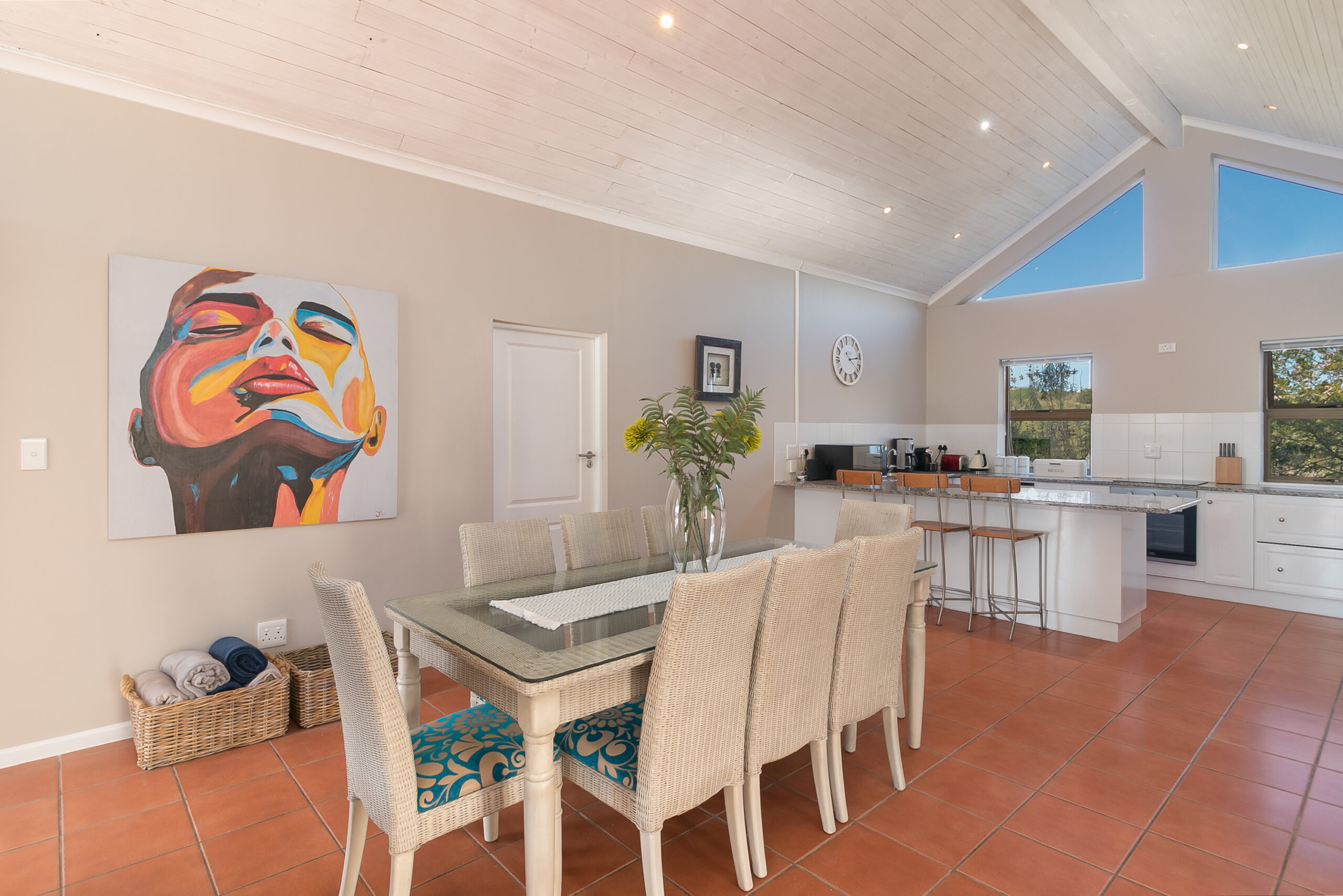 This newly refurbished home has a large open plan kitchen, lounge and dining area with a large scullery and single garage. All flow onto an entertainment deck with a swimming pool which overlooks views of the Knysna Lagoon and Outeniqua Mountains. The 4 double bedrooms (each with en-suite bathroom) have a sunny disposition and all the comforts of home. All rooms can be made up as twin or king-size beds.
