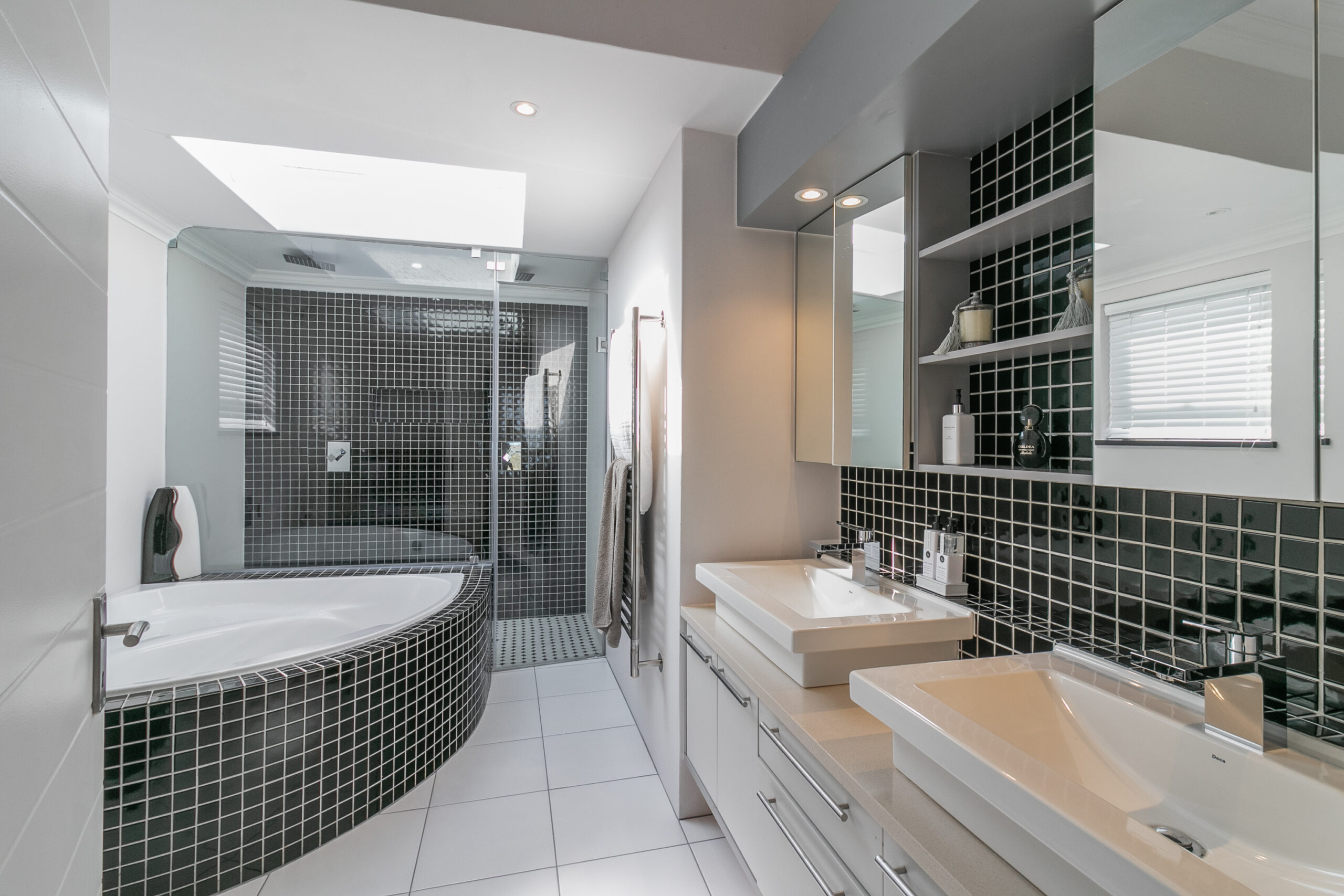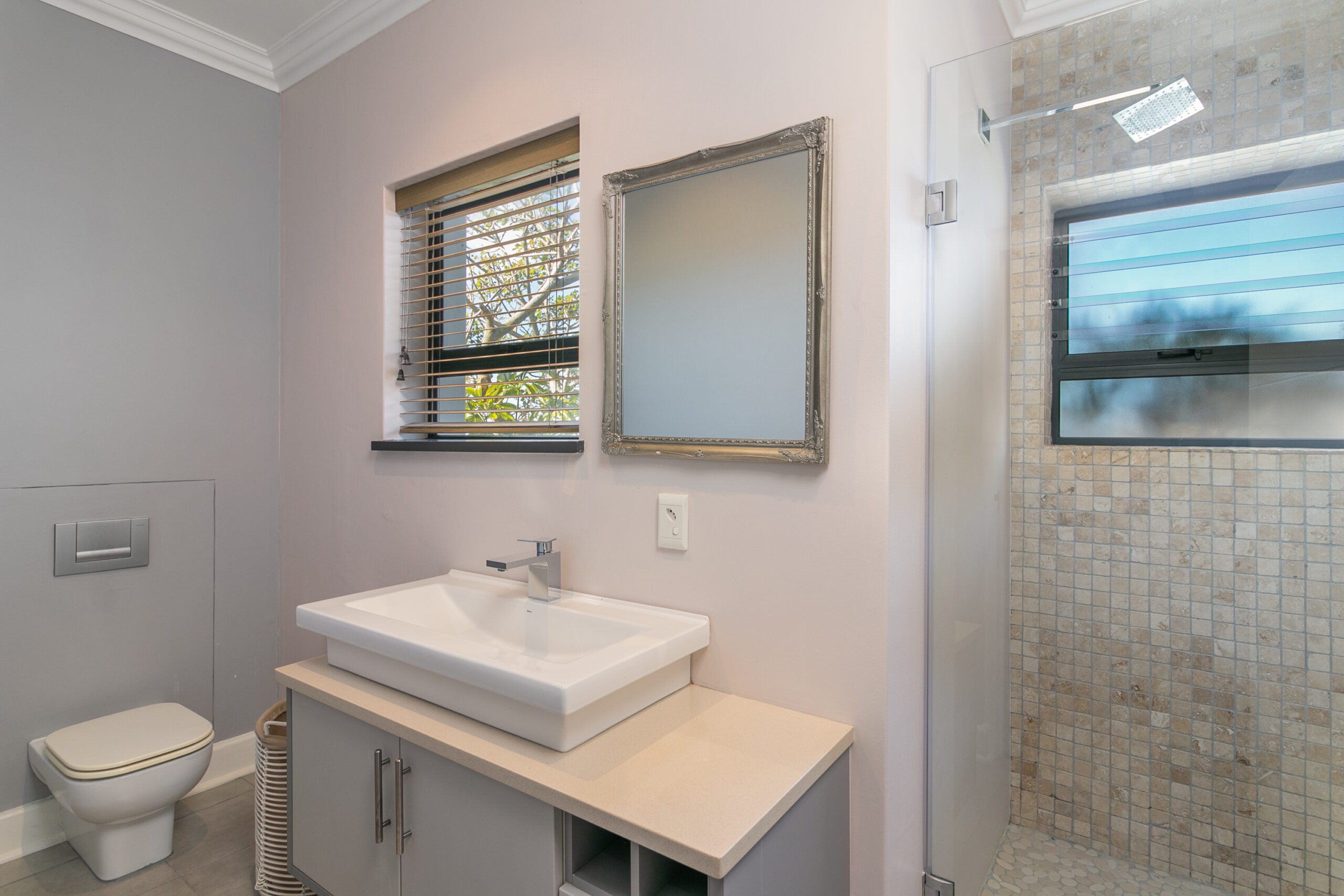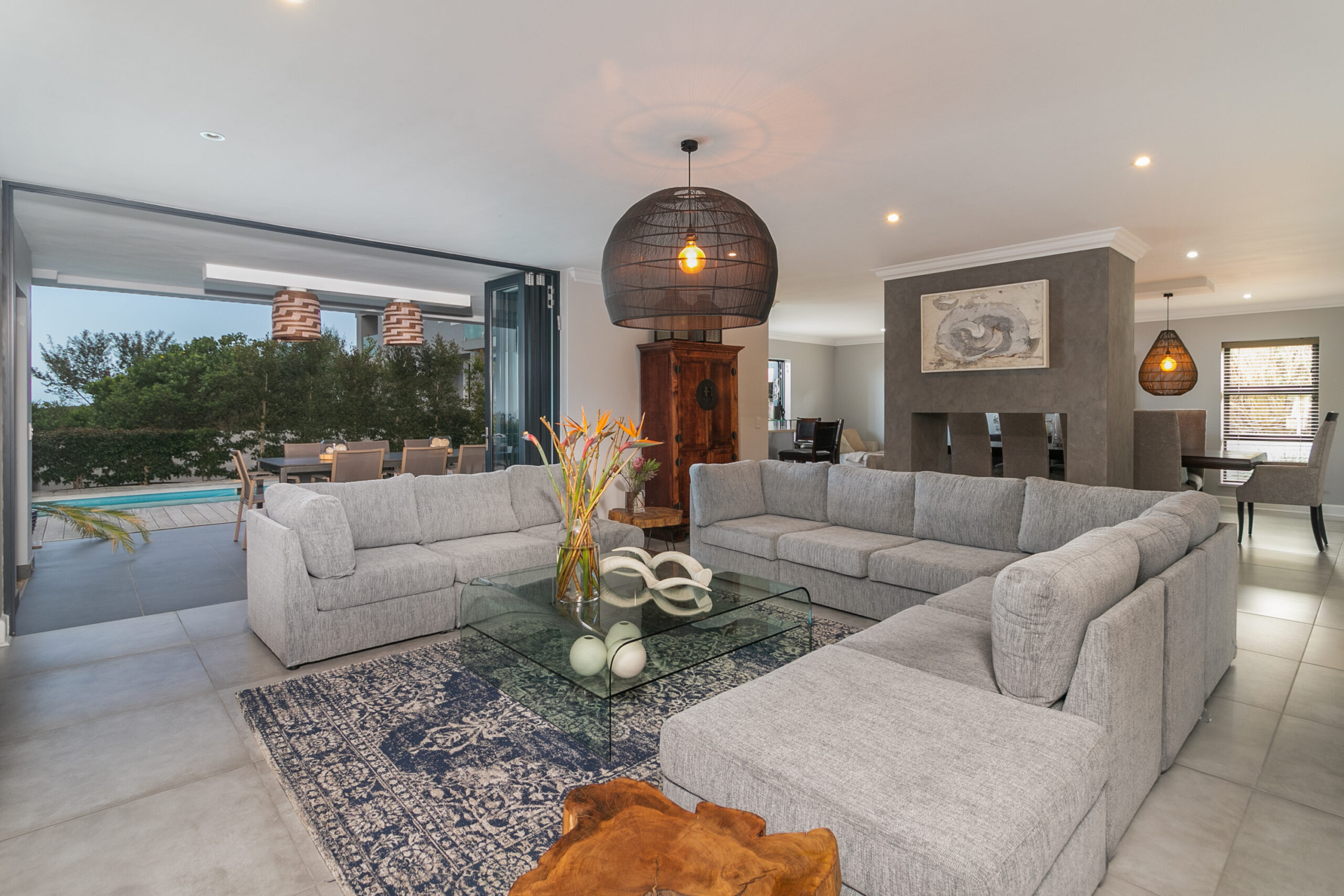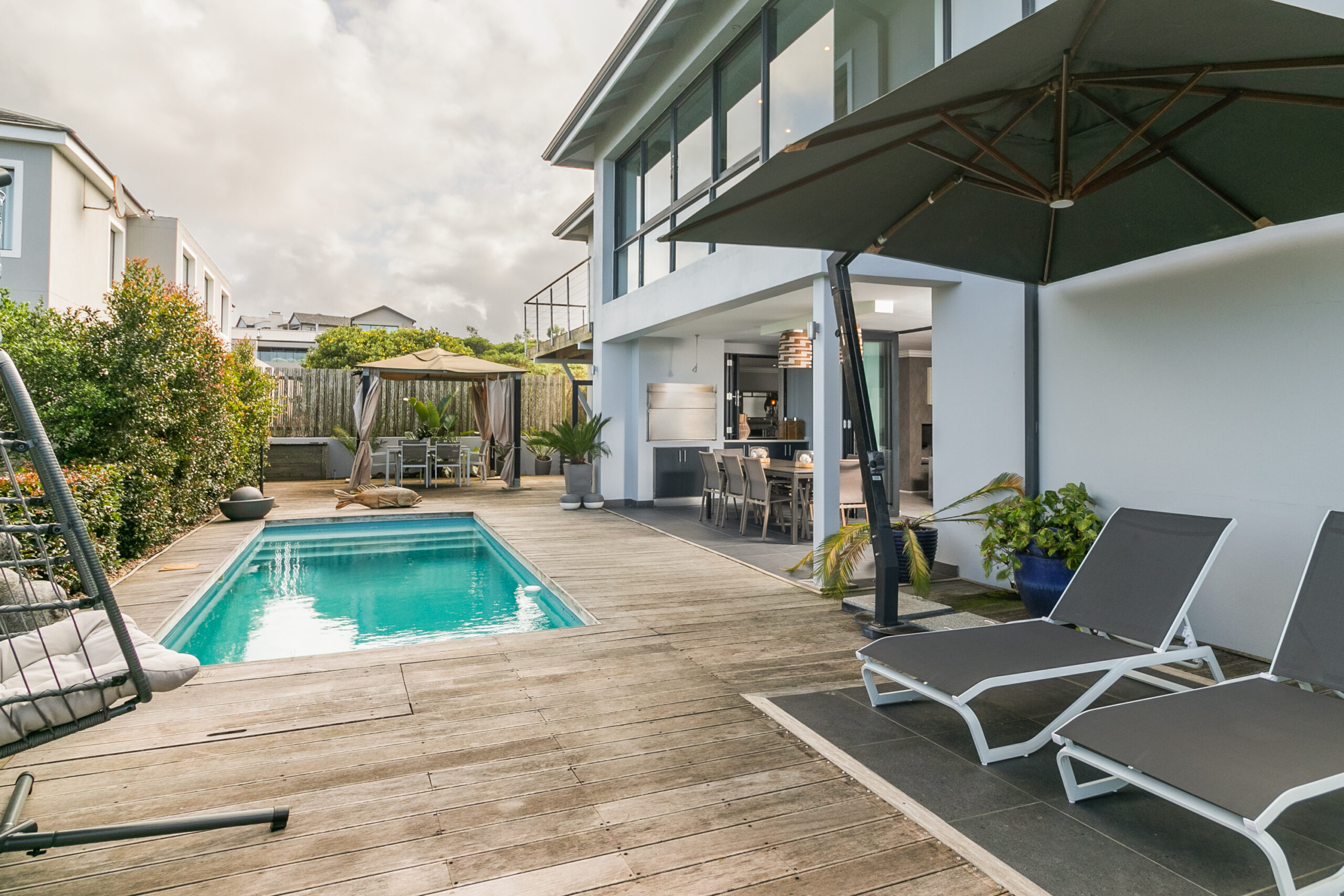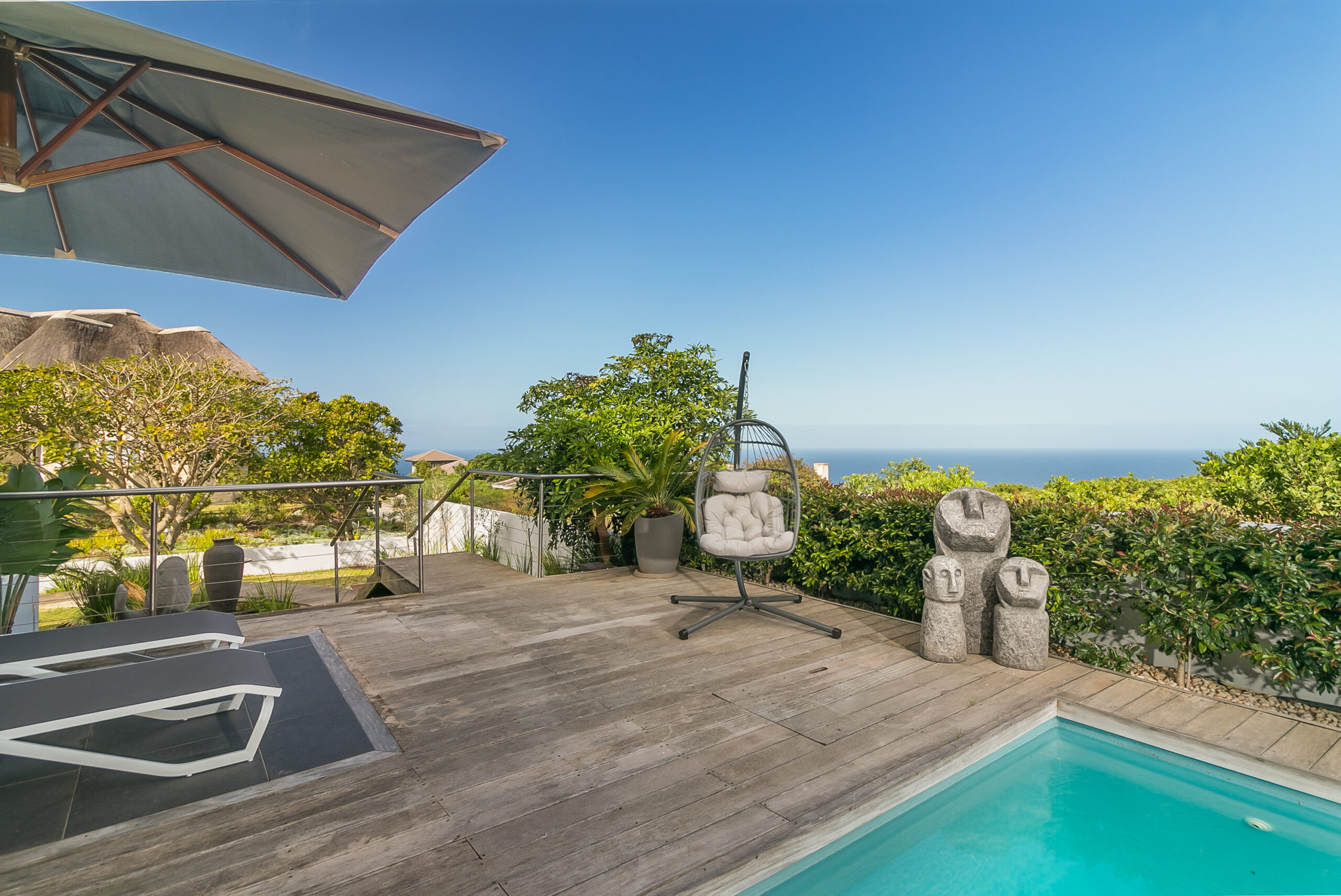 This property deserves a lisitng under our “Elite” portfolio. With a stunning, indoor/outdoor entertainment deck boasting a heated swimming pool with a view of the Ocean. The has indoor dining as well as a large patio for outdoor dining, exquitiste views to enjoy both sunrise and sunset, loads of space and excellent finishes. The 4 double bedrooms, 4 bathrooms makes ideal space for a family vacation. A very large television in the main lounge and a seperate formal lounge. The large covered pool deck also boasts a built in braai and bar for enjoying lovely evenings on the deck. Ideal for a family holiday. The poroperty now has a large back up inverter system that will ensure you have power during loadshedding hours. This does not however operate the stove or the heat pump.