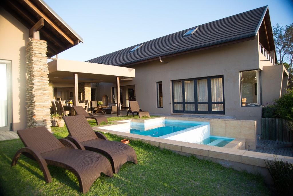 This classy luxury home has a large open plan kitchen, lounge and dining area with a large scullery and large double garage. All common rooms flow onto an entertainment deck with a swimming pool which overlooks views of the Knysna Lagoon and Outeniqua Mountains. The 4 double bedrooms (each with en-suite bathroom) have a sunny disposition and all the comforts of home. All rooms can be made up as twin or king-size beds.