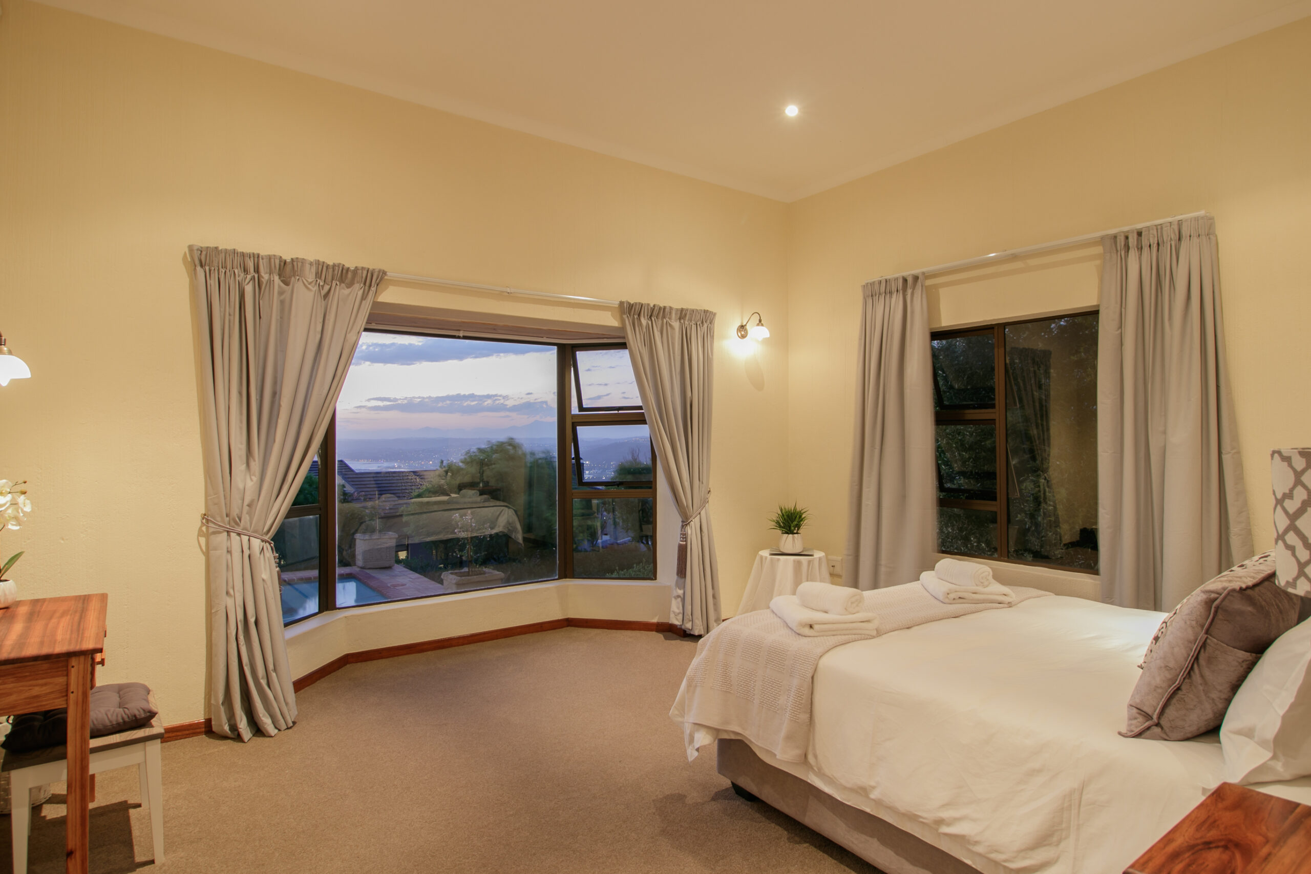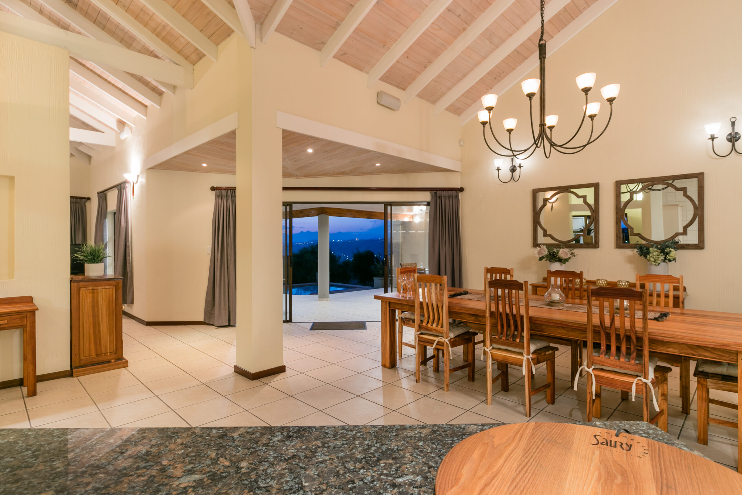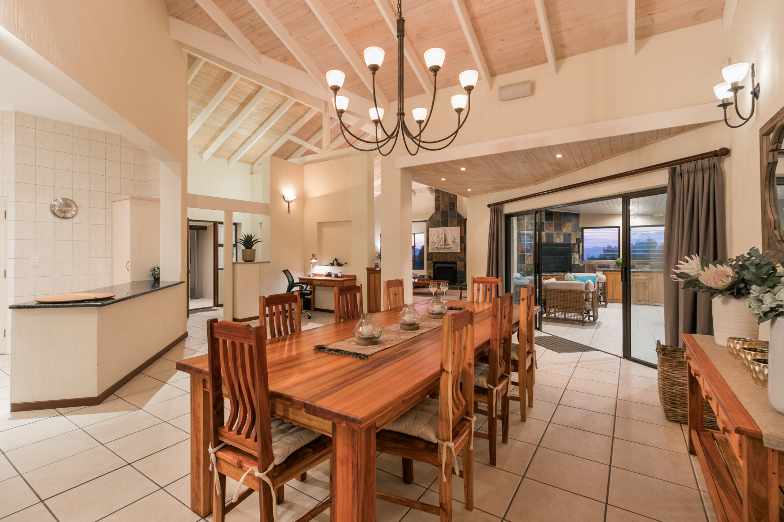 This exclusive home’s open plan lounge, kitchen and dining area flows onto an entertainment deck with a swimming pool which overlooks views of the Knysna Lagoon and Outeniqua Mountains. The 4 double bedrooms are all well appointed and have easy access onto the pool patio/deck. The large pool deck boasts a built in braai and with covered entertainment area. Ideal for a family holiday or golf group.